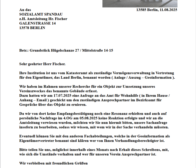 Nach unserer Gründung am 02.03.23 sind wir erneut schriftlich an die Bundesanstalt für Immobilien-Aufgaben herangetreten und haben unsere Vorstellung zur